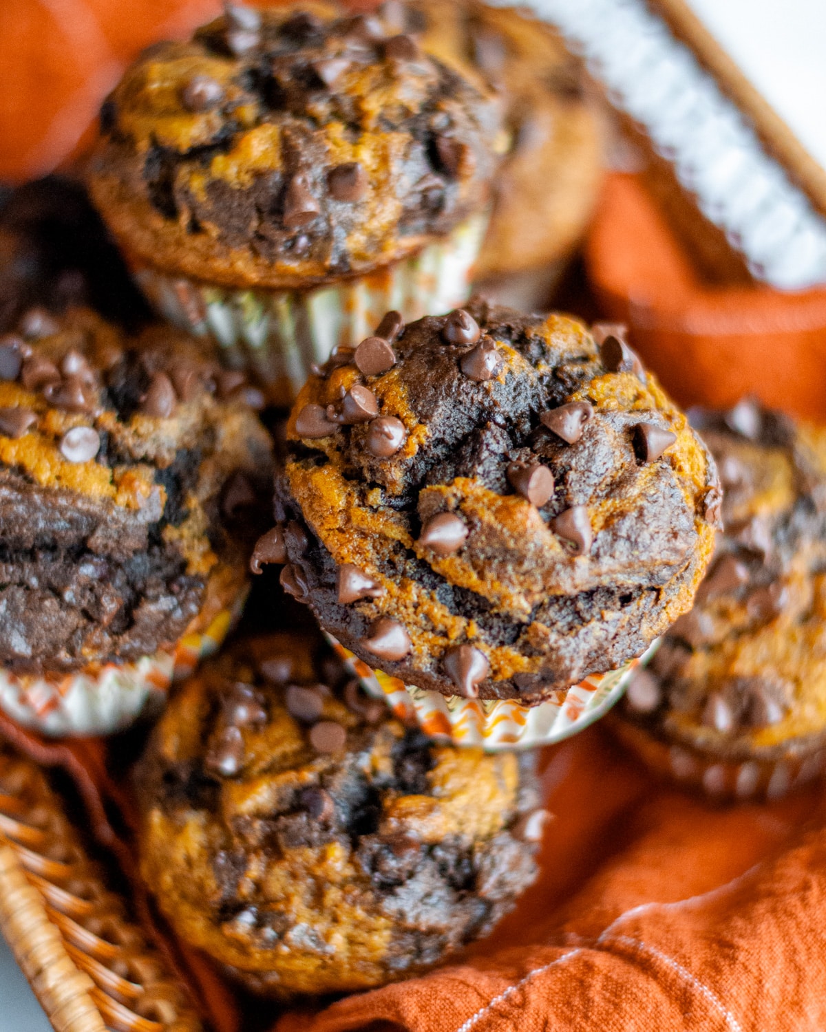 Best of both worlds flavor wise. You get the warm spices of fall that you’d expect in pumpkin muffins combined along with rich chocolate in every bite.
